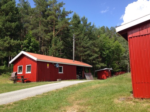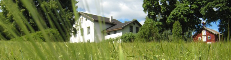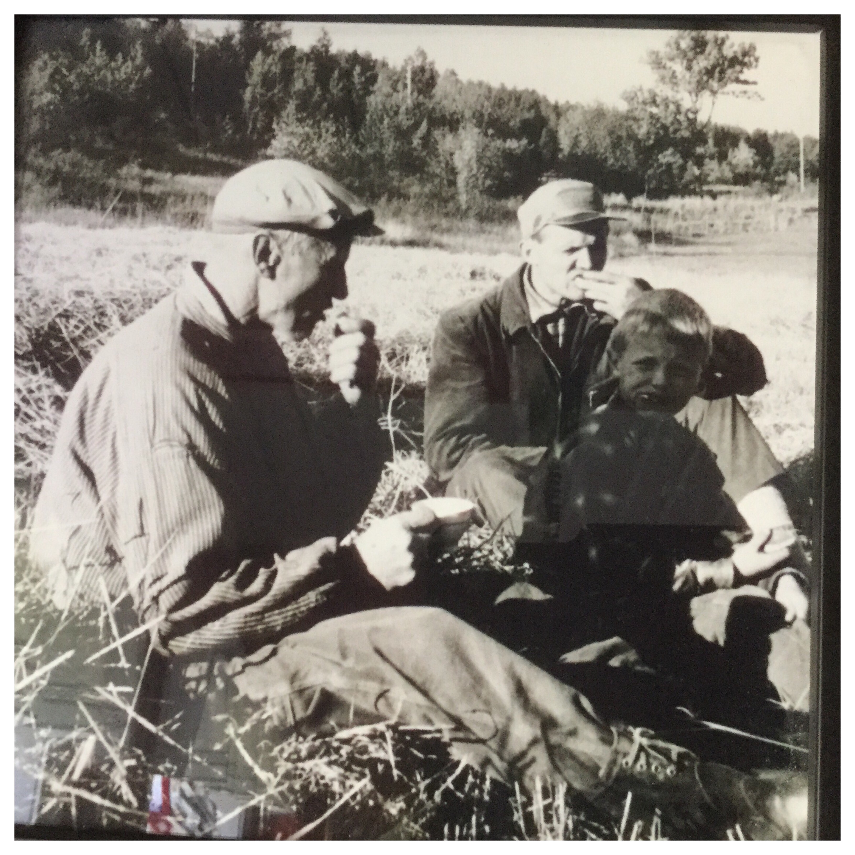Bildet er tatt på jordet nedenfor kårboligen, i en av pausene under treskinga. Legg merke til kaffekoppen! På bildet ser vi Peder Svarverud (onkelen til Marta), og yngre utgaver av Nils Skagnæs og Leif Skagnæs.